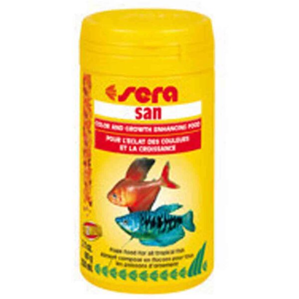 סרה סאן 250 מ”ל – מזון בסיסי לדגים הפועל לחיזוק הצבע של הדג. מזון מורכב מפתיתים, השומרים על צורתם לאורך זמן, ולא מעיבים על המים.